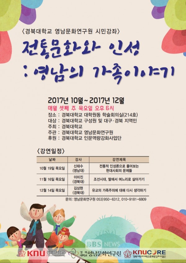 경북대 영남문화연구원이 이달부터 12월까지 매달 셋째 주 목요일 오후 6시 ‘전통문화와 인성 : 영남의 가족 이야기’를 주제로 시민강좌를 진행합니다.