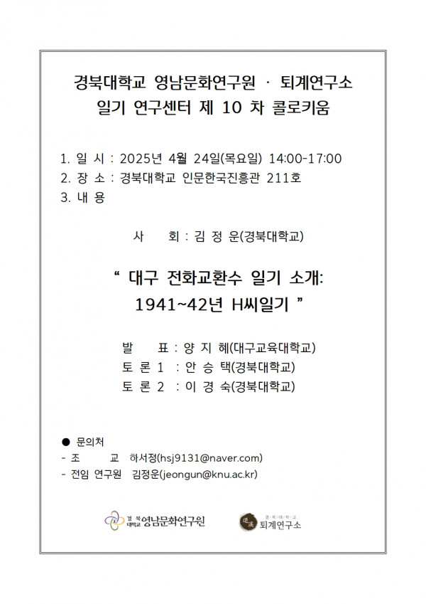 경북대학교 영남문화연구원 · 퇴계연구소 일기 연구센터 제10차 콜로키움 안내(2025.04.24)