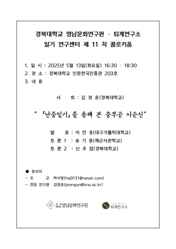 경북대학교 영남문화연구원 · 퇴계연구소 일기 연구센터 제11차 콜로키움 안내(2025.05.13)