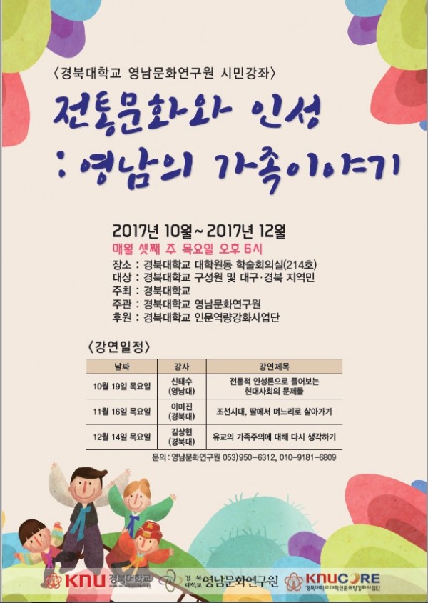 10월부터 12월까지는 '가족'을 중심으로 "전통문화와 인성: 영남의 가족이야기"라는 주제하에 대학생 및 지역민들과 가족에 대한 의미를 함께 고민할 수 있는 시간을 가지고자 합니다. 10월의 주제 및 강연 일정은 다음과 같습니다. 관심있는 분들의 많은 참여를 바랍니다.