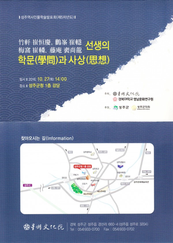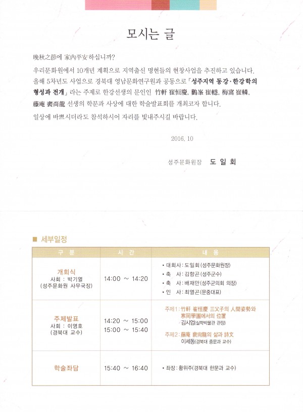 이전글 다음글 목록 작성자 영남문화연구원 | 등록일 16-10-24 17:03 | 조회 2,312회 성주역사인물 학술발표회 안내 관련링크 본문 성주역사인물 학술발표회 안내 일시 : 2016년 10월 27일(목) 14:00~장소 : 성주군청 1층 대강당주최 : 경북대학교 영남문화연구원, 성주문화원후원 : 성주군, 경북대학교 이전글 다음글 목록