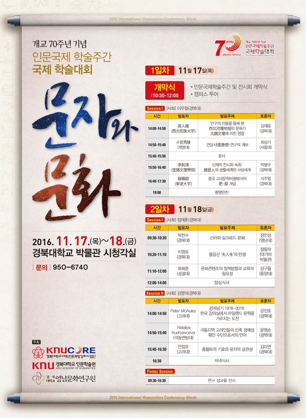 • 주최: 경북대학교 인문대학, 인문학술원, 영남문화연구원, 대학인문역량강화사업단, 국문과 BK 사업단, 사학과 BK 사업단