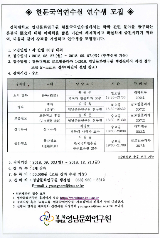경북대학교 영남문화연구원 한문국역연수실에서는 매 학기마다 한문강좌를 운영하고 있습니다. 관심 있는 분들의 많은 참여를 바랍니다.