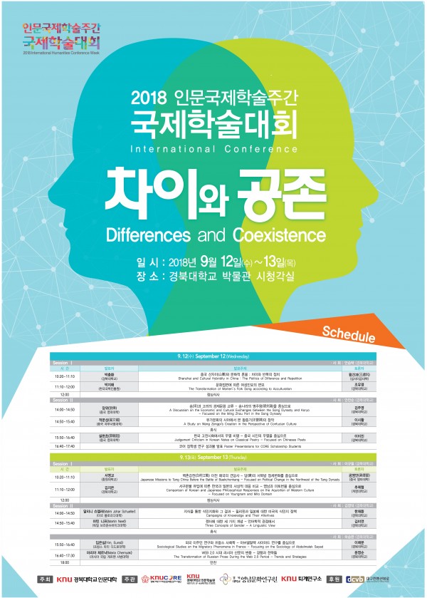 2018年 경북대학교 영남문화연구원에서는 대학인문역량강화사업단, 인문학술원, 퇴계연구소와 “차이와 공존”을 주제로 국제학술대회를 개최합니다. 21세기에도 인류는 여전히 인종, 계급, 젠더, 언어, 종교, 문화에 대한 ‘차이’와 ‘다름’으로 세계 곳곳에서 갈등으로 치닫고 있습니다. 어떻게 하면 세계가 다양성을 존중하면서 상호공존의 가치를 실현할 것인가 하는 문제에 대한 심도있는 발표와 토론을 아래의 일정과 같이 진행하오니, 관심있는 분들의 많은 참석을 바랍니다.