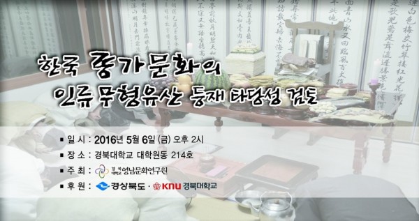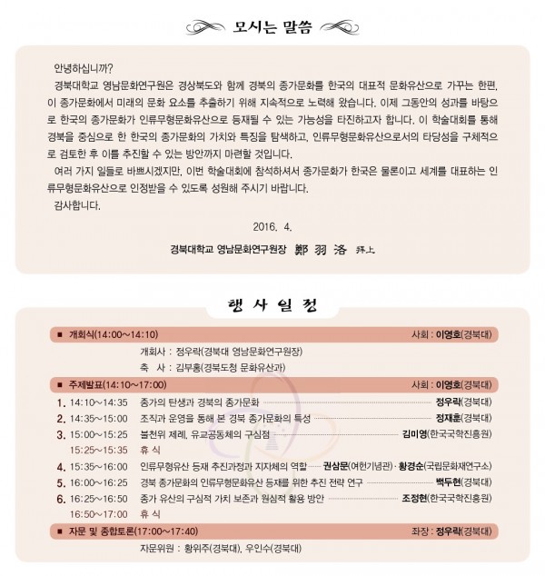 이전글 다음글 목록 작성자 영남문화연구원 | 등록일 16-04-28 14:56 | 조회 2,408회 "한국 종가문화의 인류무형유산 등재 타당성 검토" 학술대회 개최 안내 관련링크 본문 우리 연구원에서 지속적으로 관심을 기울여 온 종가문화에 대한 학술대회가 개최됩니다.관심 있으신 분들의 많은 참석 바랍니다. 이전글 다음글 목록