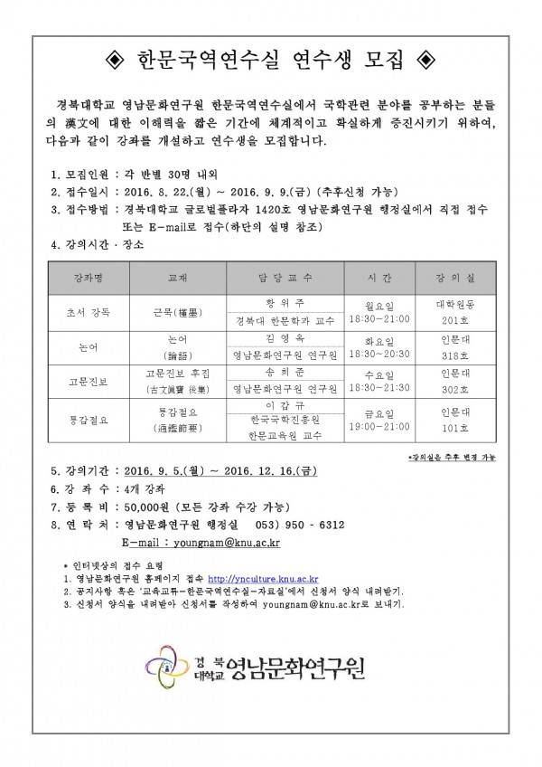 이전글 다음글 목록 작성자 영남문화연구원 | 등록일 16-08-24 11:57 | 조회 1,315회 2016년 2학기 한문국역연수실 연수생 모집 관련링크 본문 본 연구원에서 2016년 2학기 한문국역연수실 연수생을 모집하오니 많은 신청 바랍니다. 이전글 다음글 목록