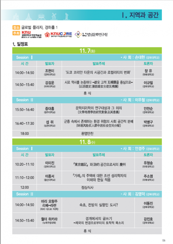 다음글 목록 작성자 영남문화연구원 | 등록일 20-08-31 13:42 | 조회 1,141회 2017 인문국제학술주간 국제학술대회 <지역과 공간> 관련링크 본문 2017 인문국제학술주간 국제학술대회 <지역과 공간>일시 : 2017.11.07.~11.09.장소 : 경북대학교 글로벌플라자 경하홀1 다음글 목록