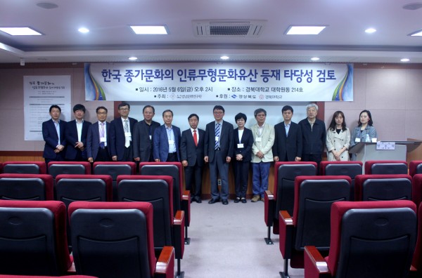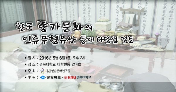한국 종가문화의 인류무형유산 등재 타당성 검토[2016] 관련링크 이전글 다음글 목록 본문 한국 종가문화의 인류무형유산 등재 타당성 검토 일씨: 2016년 5월 6일(금) 장소: 경북대학교 대학원동 학술회의실 214호 주최: 경북대학교 영남문화연구원 후원: 경상북도, 경북대학교 이전글 다음글 목록